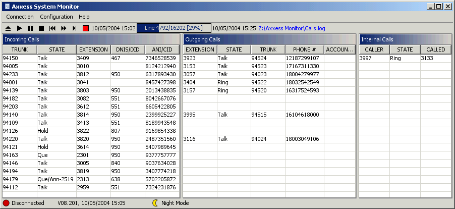 This Computer Telephony Application, developed to work with Inter-Tel Axxess® and Mitel 5000® phone system, provides a real-time display of all the calls in the system. This application was designed to be used by the technical personnel as a troubleshooting tool to better service and maintain customer equipment.